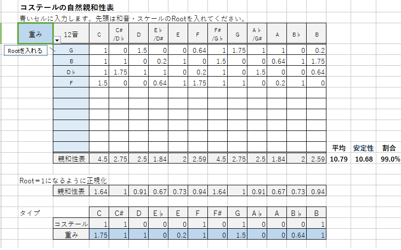 ツールは、完全8,4,5度と半音だけでなく、好きなように重み付けが出来ます。